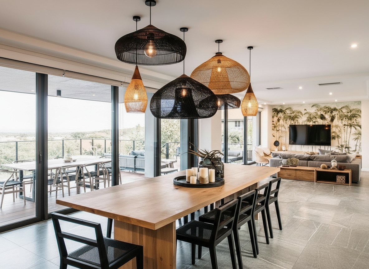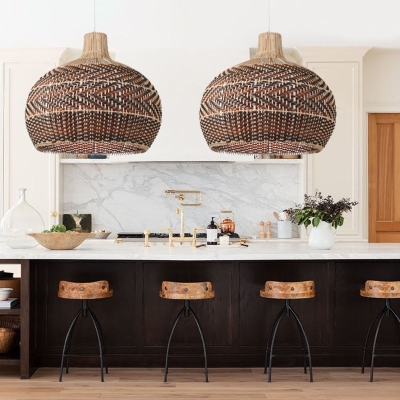 Übergroße Rattan-Pendelleuchte mit gewebtem Käfiglampenschirm für Kücheninsel