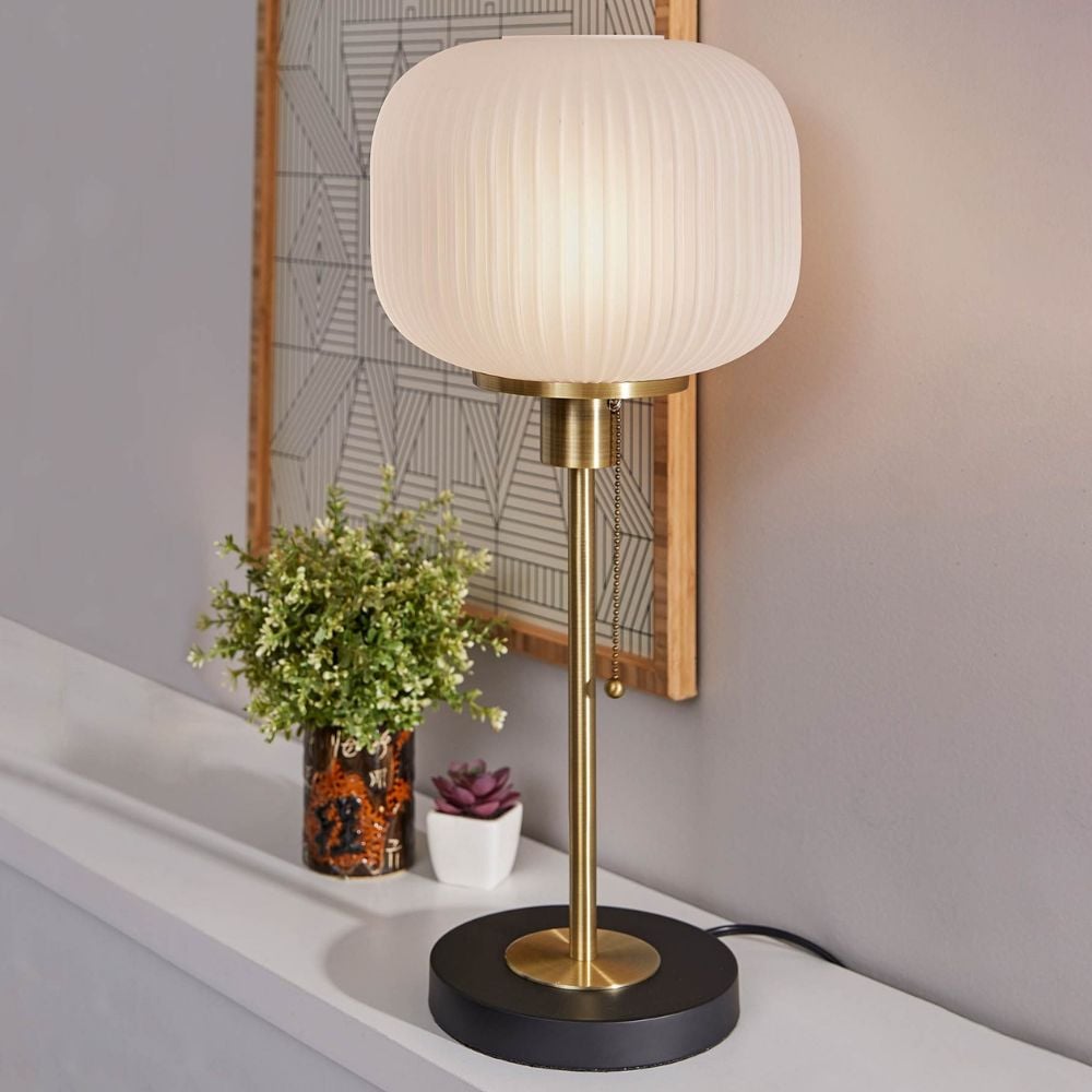 Pelviona Tischlampe aus geripptem Glas – Sockel aus Messing und schwarzem Metall – Must-Have für die Inneneinrichtung